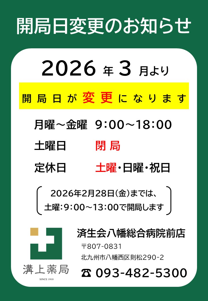 HOME > 溝上薬局 お知らせ一覧 > 溝上薬局 済生会八幡総合病院前店の営業時間変更について