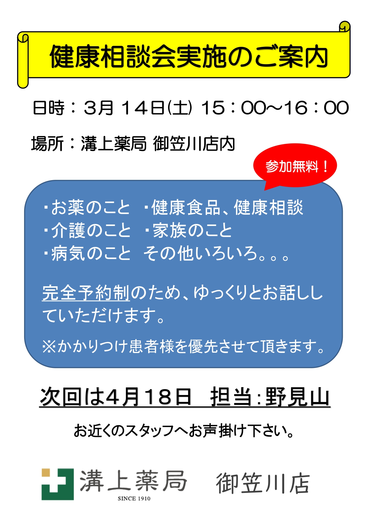 溝上薬局御笠川店にて、健康相談会を開催いたします!(無料)