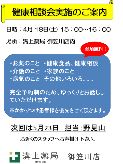 溝上薬局御笠川店にて、健康相談会を開催いたします!(無料)