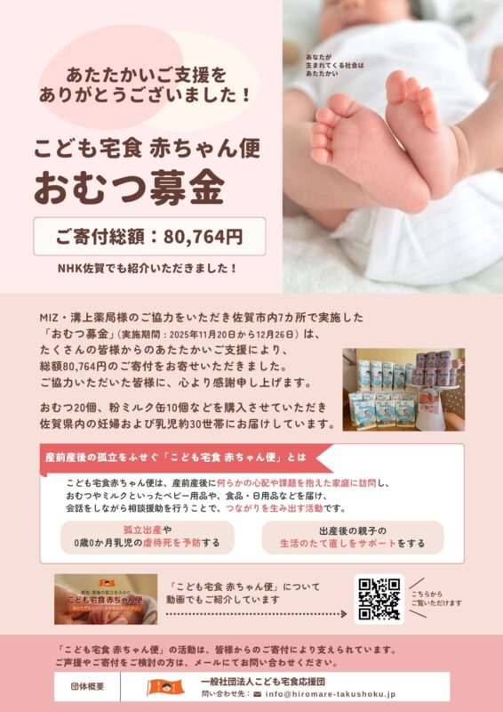 一般社団法人こども宅食応援団が取り組む「こども宅食 赤ちゃん便 おむつ募金」を、佐賀市内のMIZ・溝上薬局7店舗で実施しました。
