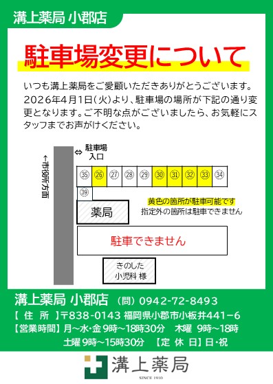 HOME > お知らせ一覧 > 【溝上薬局 小郡店】4月1日~駐車場変更に関して